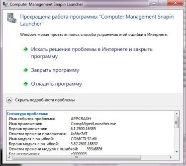 Ошибка: «Прекращена работа программы «Computer Management Snapin Launcher»»